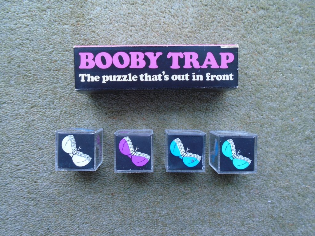 I knew this puzzle existed as it is in the Jerry Slocum mechanical puzzle collection at Indiana University but it only showed the box. What was inside? I now know it is coloured bras. Very rare £15