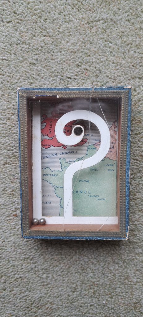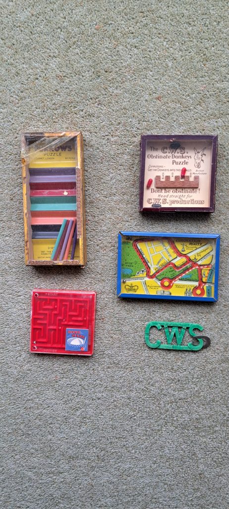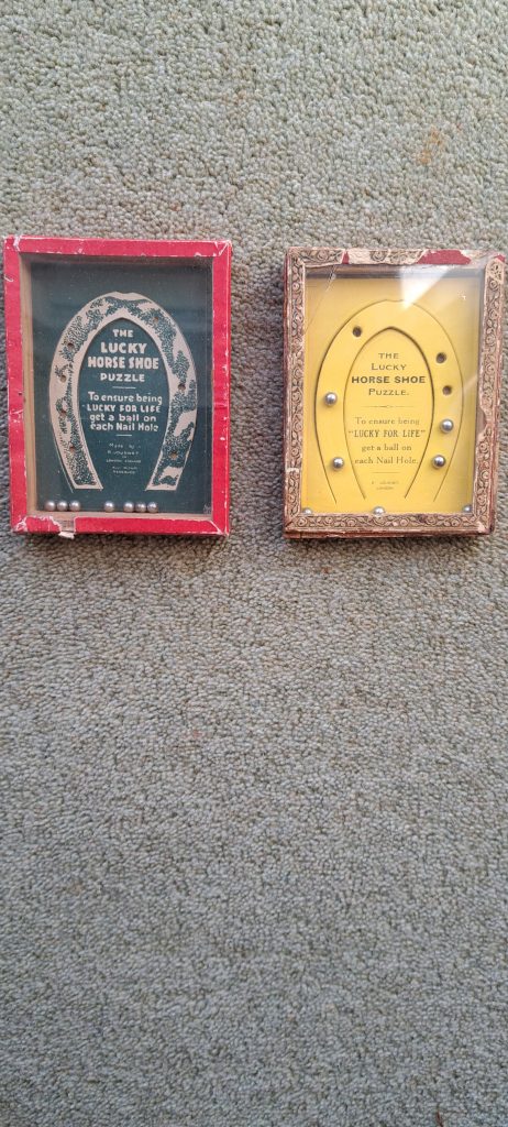 Journet variation. There is no black blob above the furrows. An advertising Obstant Donkey. I have a copy without advert. A dexterity coronation tin puzzle. A cast puzzle. A Maze puzzle which is a copy of an American puzzle called